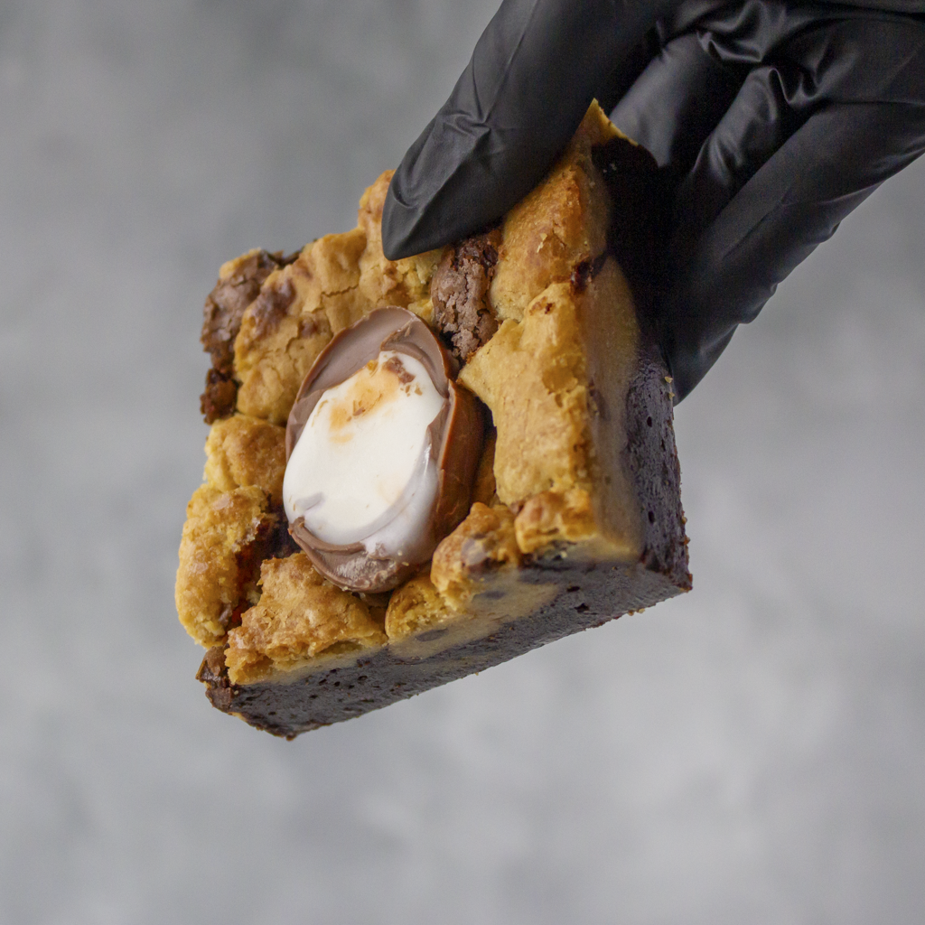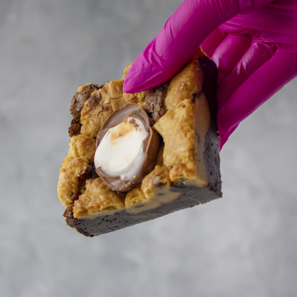 A soft, buttery cookie base meets a rich, fudgy brownie, swirled and studded with melting Crème Egg pieces that create pockets of creamy fondant in every bite. It’s indulgent, nostalgic and completely irresistible.