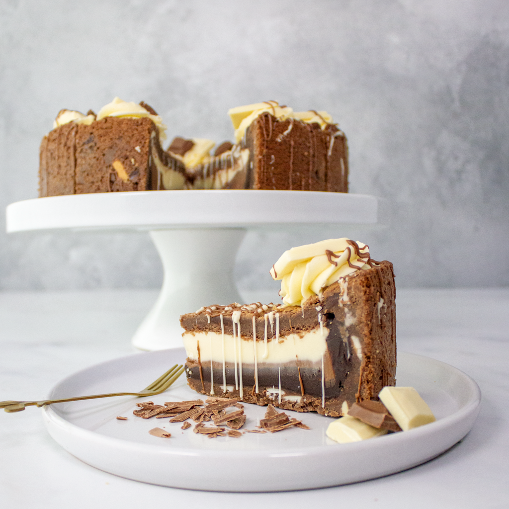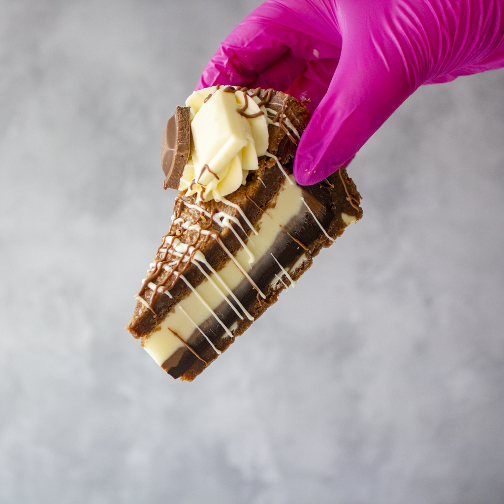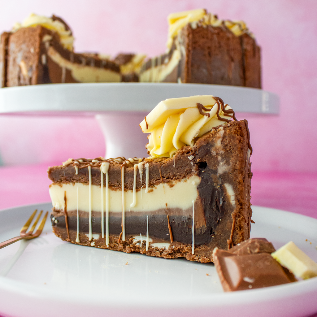 🍫 Triple chocolate goodness – milk, dark, and white chocolate in every slice.