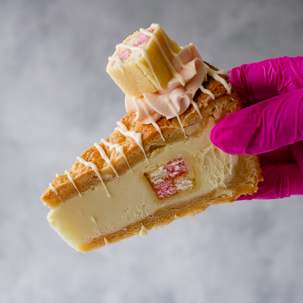 Batternburg Cookie Pie Slice: Made in a kitchen which handles CEREALS (GLUTEN), EGG, MILK, MUSTARD, NUTS, PEANUTS, SESAME, SOYA, and SULPHITES. Cookie base: Butter (MILK), MILK, salt, sugar (light brown, caster), WHEAT flour [WHEAT flour, calcium carbonate, niacin (B3), iron, thiamin (B1)], WHEAT gluten; sodium carbonates, EGG, vanilla extract, white chocolate (sugar, cocoa butter, whole MILK powder, emulsifier (E322 SOYA lecithin) and natural vanilla flavour). White chocolate: Sugar, vegetable oil (shea, sunflower), whole MILK powder, 10% white chocolate (whole MILK powder, whey MILK powder, sugar and cocoa butter), whey MILK powder, emulsifier (SOYA lecithin, E471) and natural flavours. May contain NUTS. Mini battenbergs: Icing sugar, apricot filling (glucose-fructose syrup, apricot purée, sugar, water, gelling agent (pectin), acid (citric acid), acidity regulator (sodium citrates), preservative (potassium sorbate)), sugar, WHEAT flour (with added calcium, iron, niacin, thiamin), glucose syrup, vegetable oils (palm, rapeseed), water, SOYA flour, desiccated coconut, skimmed MILK powder, humectant (vegetable glycerine), dried EGG white, dried EGG, raising agents (disodium diphosphate, sodium bicarbonate), salt, emulsifier (mono- and diglycerides of fatty acids), stabiliser (xantham gum), preservative (potassium sorbate), flavouring, colours (carmine, lutein). May contain NUTS. Vanilla butter icing: Unsalted butter (MILK), icing sugar, vanilla extract (water, propylene glycol; colour: carotenes). Almond essence: Rapseseed oil, ALMOND oil.