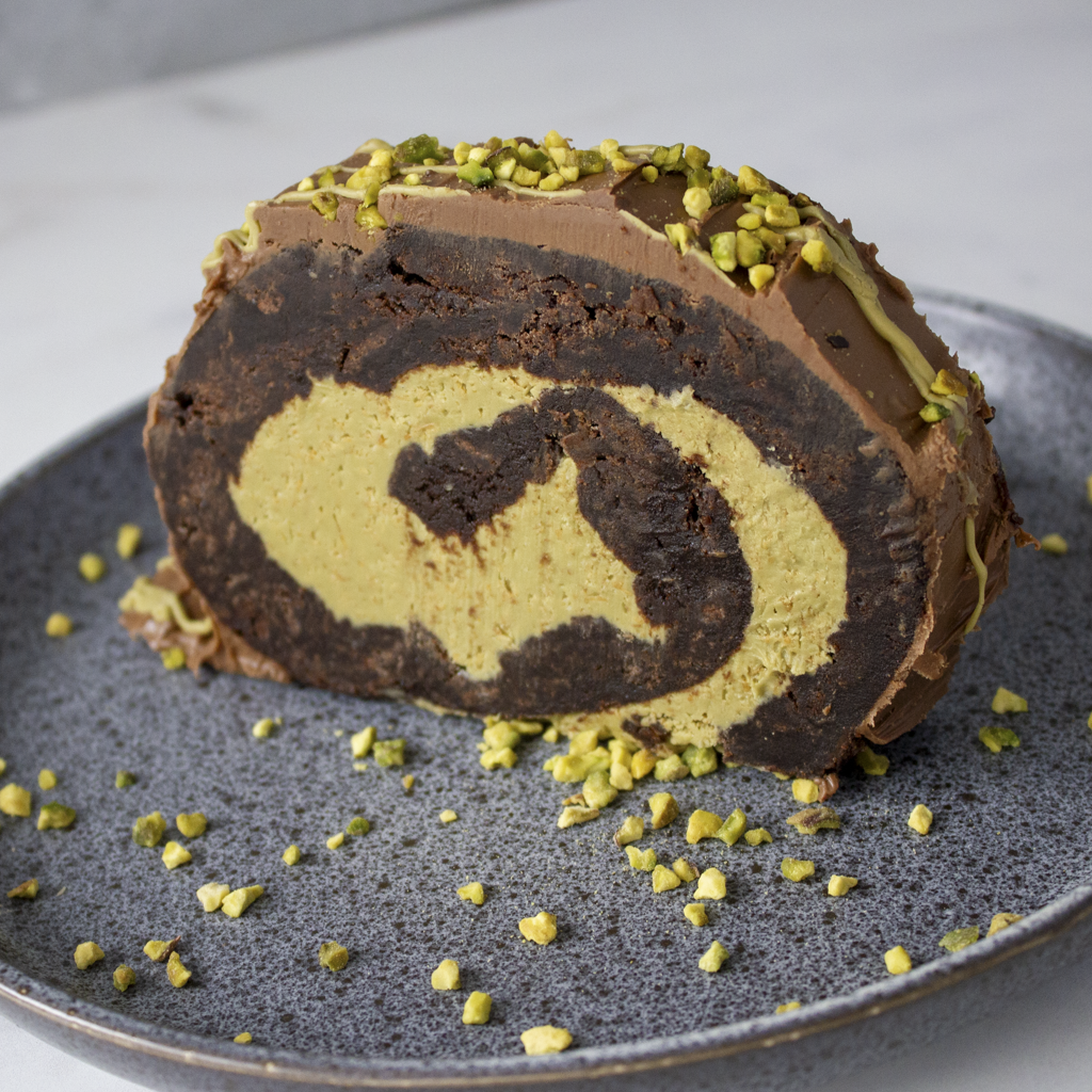 Inspired by the iconic Swiss Roll, this decadent creation starts with a dense, fudgy chocolate brownie rolled around a smooth pistachio crème filling. It's topped with silky chocolate ganache, finished with a pistachio drizzle, and sprinkled generously with crushed pistachios for the perfect crunch.