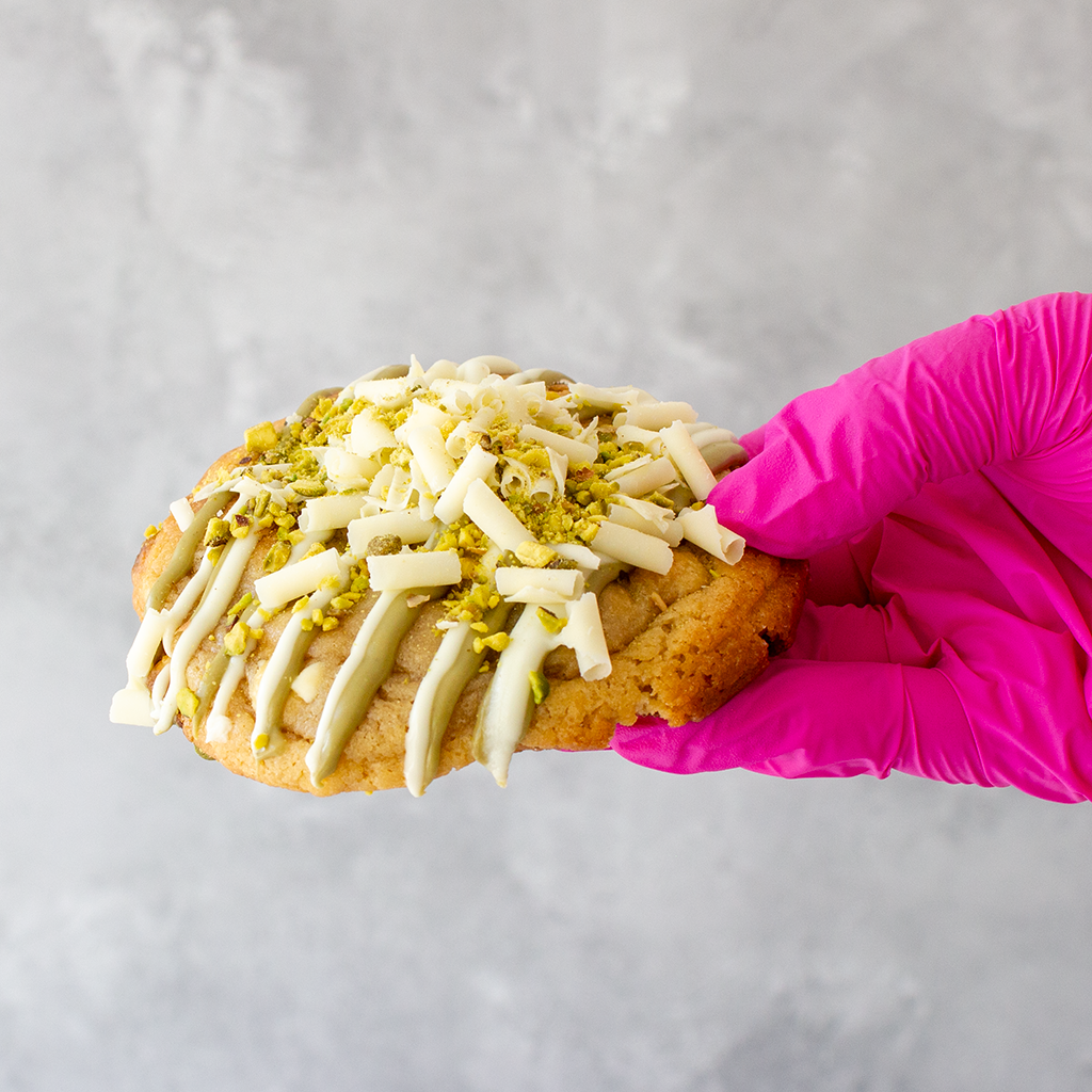 Experience the perfect blend of luxury and flavour with our Pistachio & White Chocolate Stuffed Deluxe Cookie. Handcrafted with care, this oversized treat features a golden, buttery cookie base infused with crunchy roasted pistachios, delivering a rich, nutty depth in every bite. As you sink your teeth in, you'll discover a decadent pistachio filling, oozing with creamy sweetness to create an irresistible contrast of textures and flavours. Topped with white chocolate & pistachio drizzles and white chocolate curls.