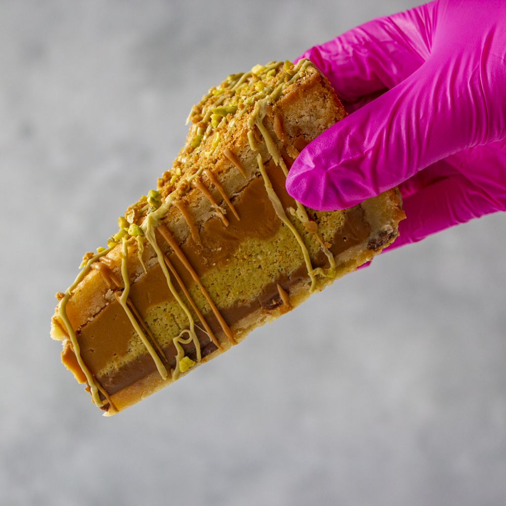 Made in a kitchen which handles CEREALS (GLUTEN), EGG, MILK, MUSTARD, NUTS, PEANUTS, SESAME, SOYA, and SULPHITES. Cookie base: Butter (MILK), MILK, salt, sugar (light brown, caster), WHEAT flour [WHEAT flour, calcium carbonate, niacin (B3), iron, thiamin (B1)], WHEAT gluten; sodium carbonates, EGG, vanilla extract, MILK chocolate (sugar, cocoa butter, whole MILK powder, cocoa mass, dextrose, concentrated butter (MILK), emulsifier (E322 sunflower lecithin), and natural vanilla flavour). May contain SOYA and traces of NUTS. Dark cookie crumbs: WHEAT flour, sugar, vegetable oil (palm, rapeseed) in vary proportions, invert sugar syrup, fat reduced cocoa powder alkalized, whey powder (MILK), fat reduced cocoa powder, raising agent (sodium bicarbonate). May contain traces of SOY and EGG. Biscoff spread: Caramelised biscuits 58% (WHEAT flour, sugar, vegetable oils (palm, rapeseed), candy sugar syrup, raising agent (sodium hydrogen carbonate), SOYA flour, salt, cinnamon), rapeseed oil, sugar, emulsifier (SOYA lecithin, citric acid). May contain traces of NUTS (HAZELNUTS). Milk chocolate: Sugar, vegetable oil and fat (shea, sunflower), whole MILK powder, 10% MILK chocolate (sugar, fat reduced cocoa powder, butter (MILK), whole MILK powder, whey MILK powder and cocoa butter), whey MILK powder, fat reduced cocoa powder, emulsifier (E322 SOYA lecithin, E471) and natural flavours. May contain traces of NUTS. Pistachio spread: Sugar, vegetable oils and fats (karite, sunflower), PISTACHIO paste, lactose, whey MILK powder, skimmed MILK powder, emulsifier (E322 SOYA lecithin, E471), spirulina extracte and natural colour (lutein). May contain traces of other NUTS. Pistachio spread: Sugar, vegetable oils and fats (karite, sunflower), PISTACHIO paste, lactose, whey MILK powder, skimmed MILK powder, emulsifier (E322 SOYA lecithin, E471), spirulina extracte and natural colour (lutein). May contain traces of other NUTS. Chopped pistachio NUTS.