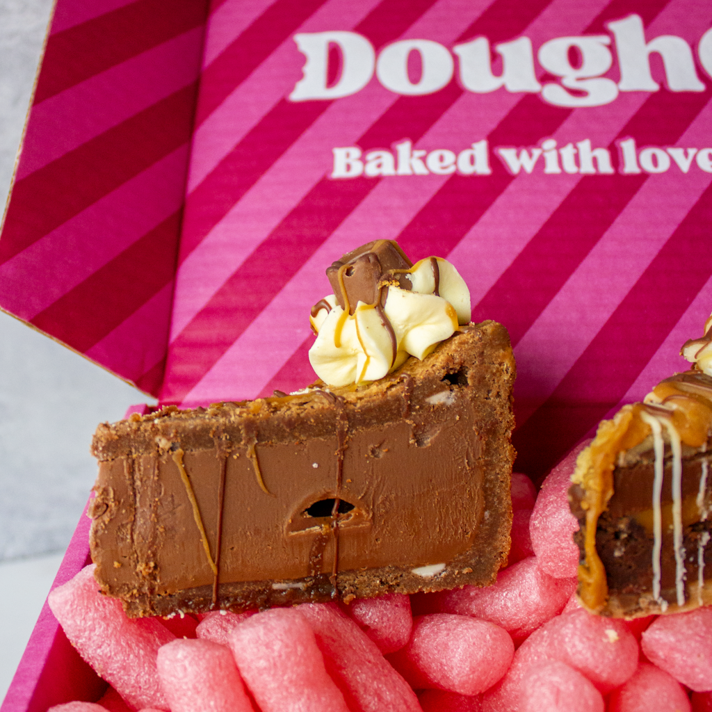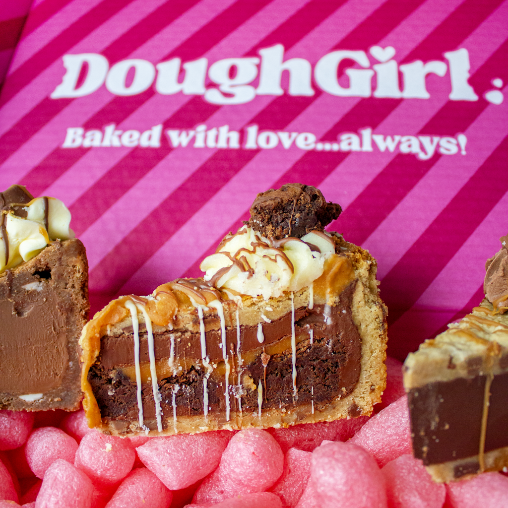 Made in a kitchen which handles CEREALS (GLUTEN), EGG, MILK, MUSTARD, NUTS, PEANUTS, SESAME, SOYA, and SULPHITES. Cookie base: Butter (MILK), MILK, salt, sugar (light brown, caster), WHEAT flour [WHEAT flour, calcium carbonate, niacin (B3), iron, thiamin (B1)], WHEAT gluten; sodium carbonates, EGG, vanilla extract, MILK chocolate (sugar, cocoa butter, whole MILK powder, cocoa mass, dextrose, concentrated butter (MILK), emulsifier (E322 sunflower lecithin), and natural vanilla flavour). May contain SOYA and traces of NUTS. DoughGirl Classic Brownie: Plain Flour (WHEAT), Light Brown Sugar, EGG. Milk chocolate: Sugar, cocoa butter, whole MILK powder, cocoa mass, emulsifier (E322 sunflower lecithin) and natural vanilla flavouring. Dark chocolate: Sugar, cocoa mass, cocoa butter, fat reduced cocoa powder, dextrose and emulsifier (E322 sunflower lecithin). Unsalted butter (MILK). Cocoa powder. Milk chocolate: Sugar, vegetable oil and fat (shea, sunflower), whole MILK powder, 10% MILK chocolate (sugar, fat reduced cocoa powder, butter (MILK), whole MILK powder, whey MILK powder and cocoa butter), whey MILK powder, fat reduced cocoa powder, emulsifier (E322 SOYA lecithin, E471) and natural flavours. May contain traces of NUTS. Dulce De Leche: Dulce De Leche (glucose and fructose syrup, whole MILK powder, water, sugar, skimmed MILK powder, preservatives (E202)), water, sugar, modified starch (E1442), glycerine, thickening agents (E460, E466), preservatives (E202), salt, acidulant (E330). May contain traces of NUTS (HAZELNUTS).